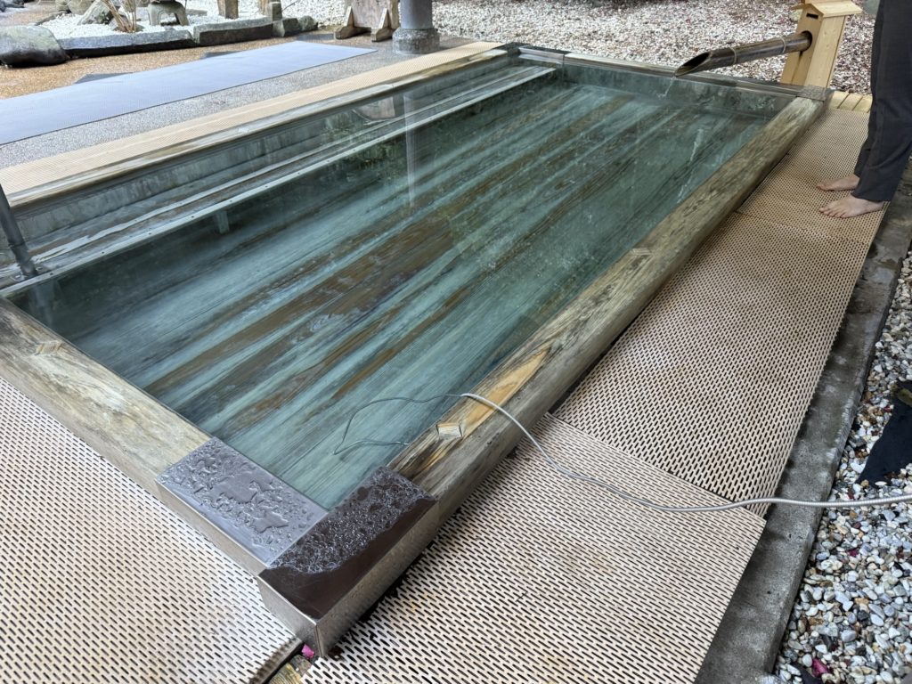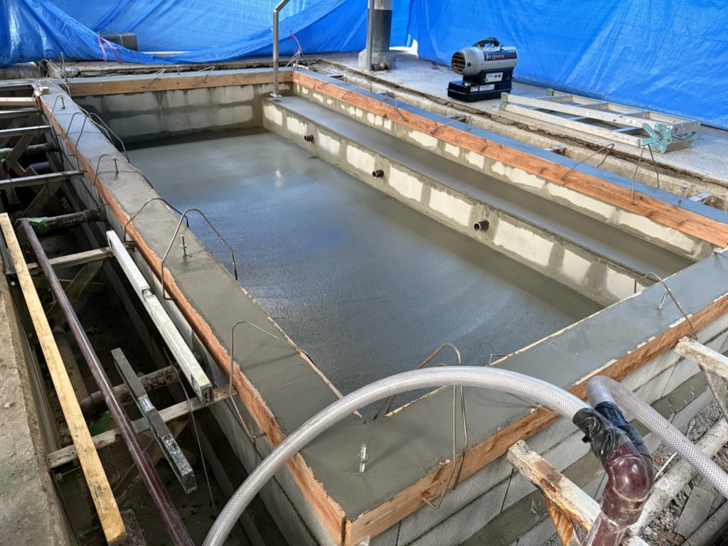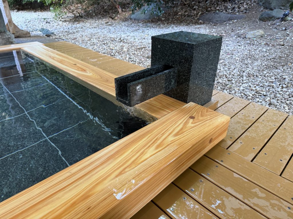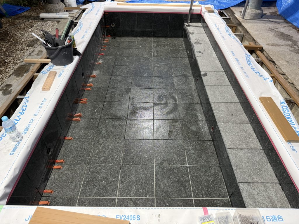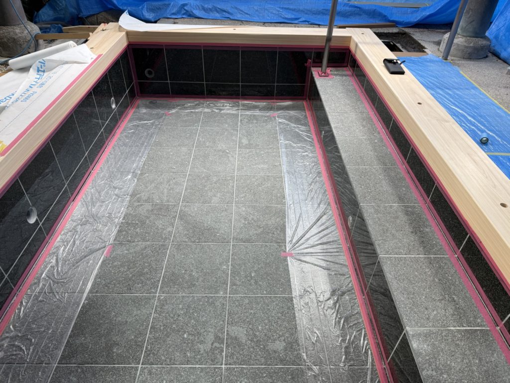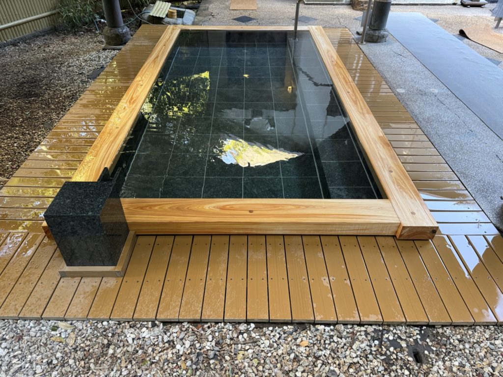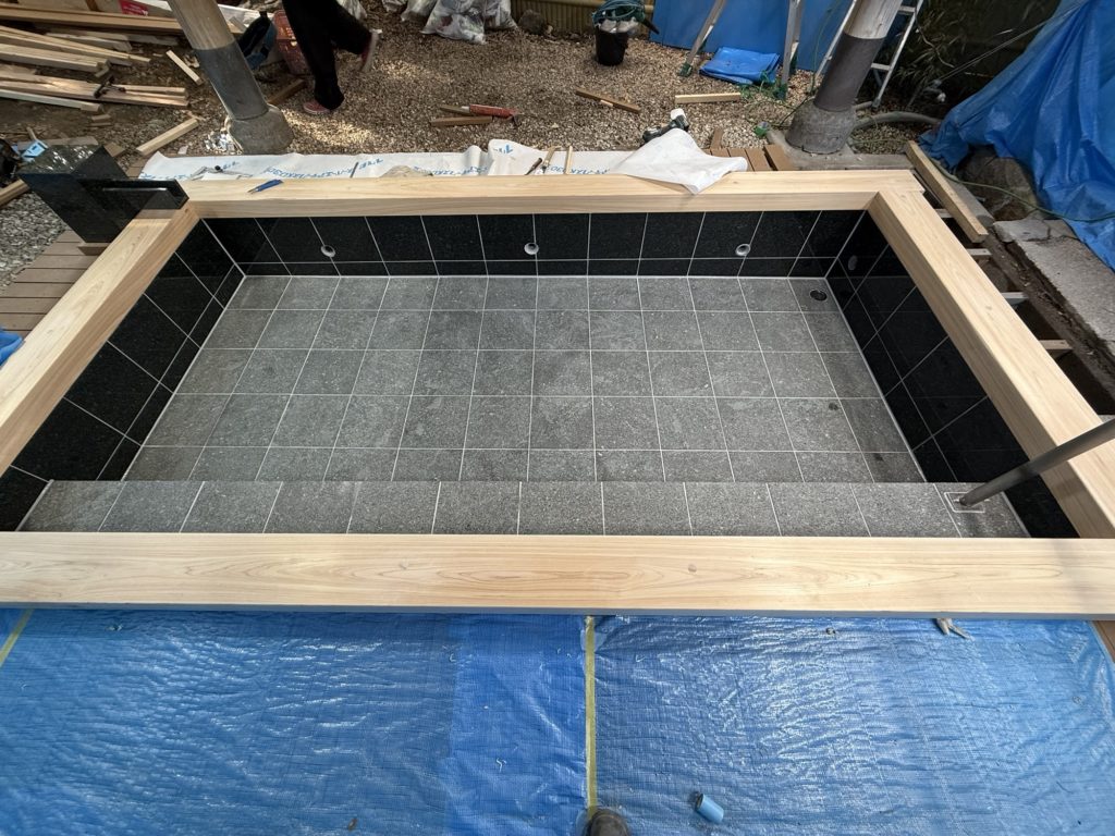 【御影石&檜の露天風呂】 2025.03.02 檜風呂を解体からの、造作風呂にします。 天端にもアンカーを取り付け、檜の玉縁をとめるためです。 御影石は、壁は本磨き(表面が磨いてあります) 床はバーナー(表面が磨いてない)になります。 最後に入隅はコーキング処理します。 吐水口は、温泉を貯める場所に一枚壁を創り独立させます、そうすることで衛生上、配管のメンテナスがしやすくなります。 御影石は、同じ石からの切り落とし加工なので、バーナーも本磨きも濡れれば色合いも一緒になります。乾いた状態と違う顔があるのも石の良ささです。 また、今回の様に檜を玉縁に取り入れることで、ぬくもりがでます。
